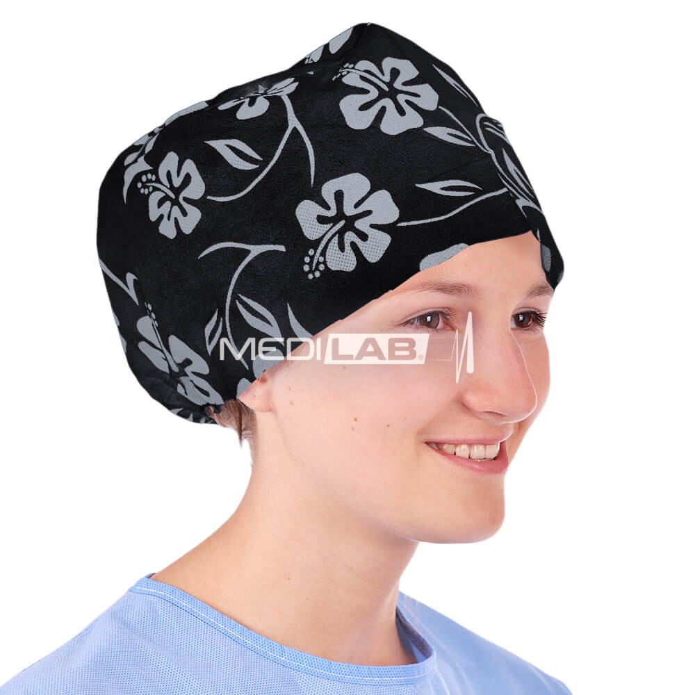 Surgical caps with tie-on, black with silver flowers